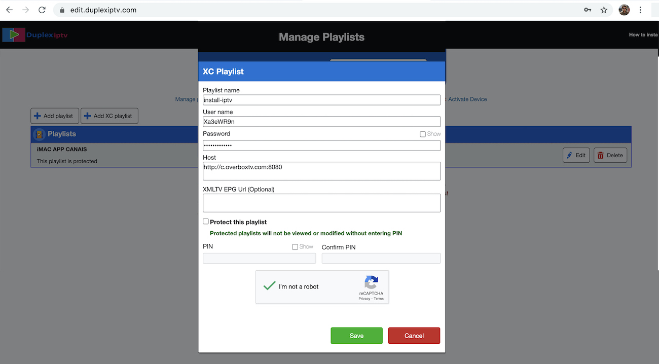 Enter UsernamePassword, and Host (Server URL of Xtream Codes connection). Complete captcha and click on Save.